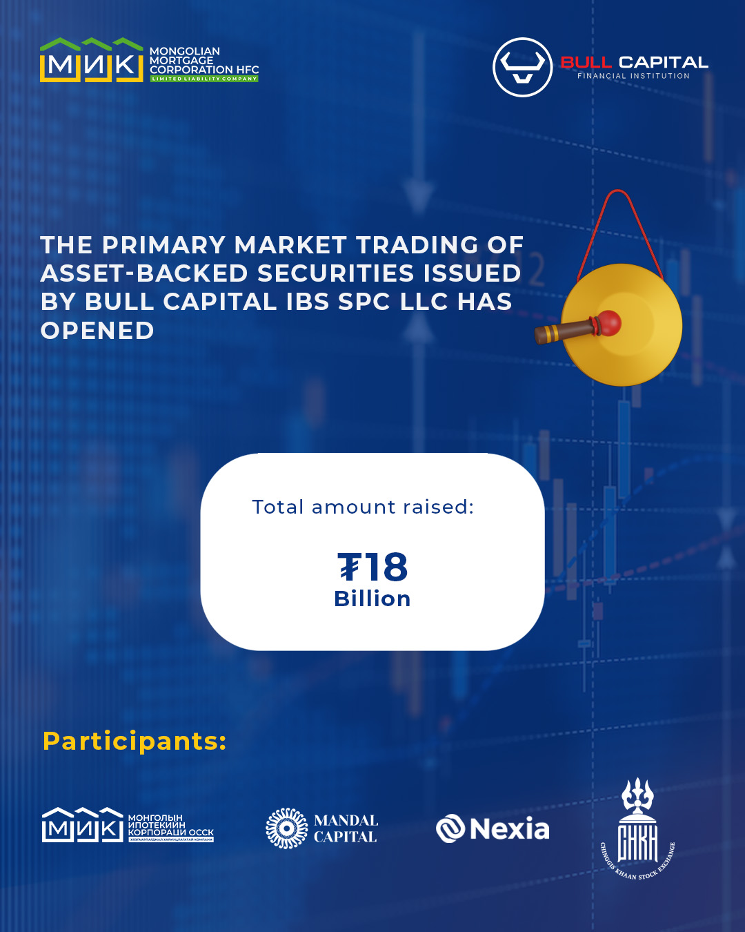 Bull Capital NBFI LLC, through Bull Capital IBS SPC LLC, is issuing MNT 18.0 billion in asset-backed securities backed by automobile fiduciary loan assets with an annual interest rate of 19.5%.