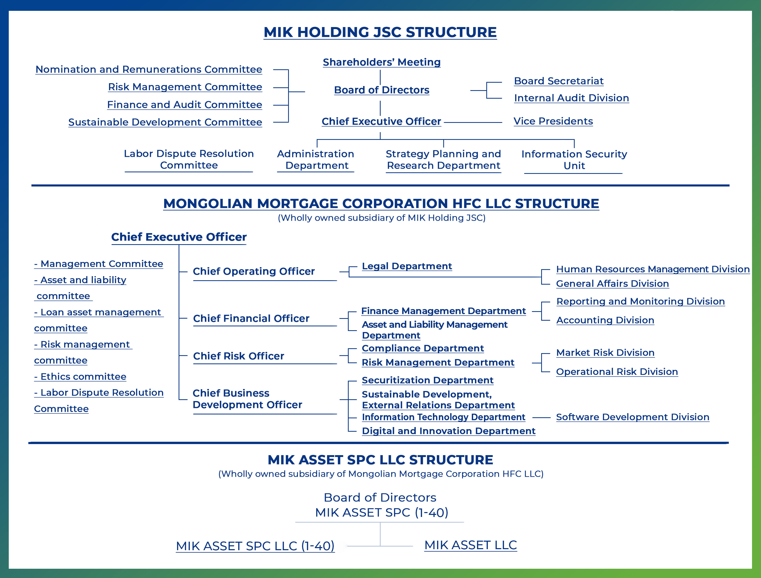 MIK group company consists of MIK Holding JSC (MIK Holding), Mortgage Corporation HFC LLC (MIK HFC), and 34 SPCs. Our operations are conducted in Mongolia, with the aim to develop the secondary mortgage market.